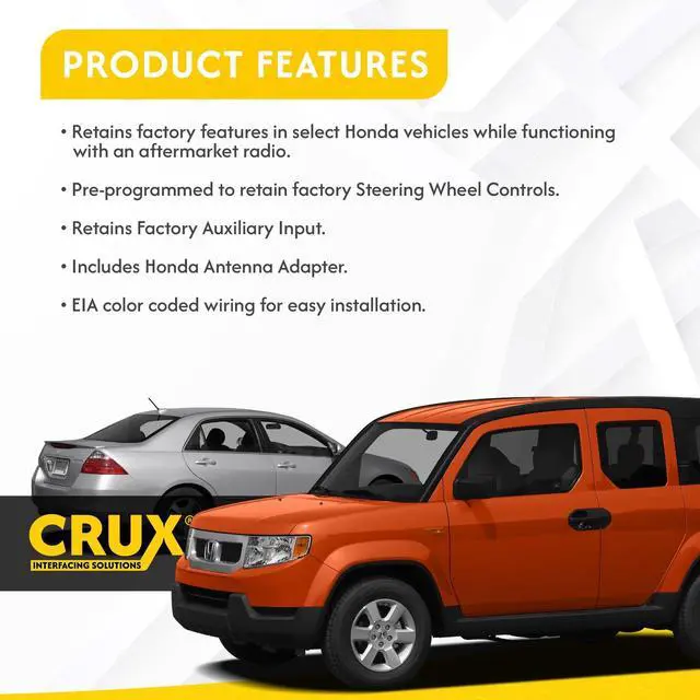 Radio replacement with SWC retention for select Honda 2003-up/ the Crux SWRHN-62D is a radio replacement interface for select Honda vehicles. It facilitates the integration of an After-market radio to enable retention of certain factory features when replacing a factory-installed radio and is also pre-programmed for retention of steering wheel controls.