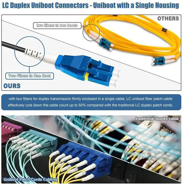 • LC Uniboot Connectors - Space-saving: LC duplex connector with uniboot is two LC connectors encased in a common housing with one boot, terminated on a single twin-fiber round cable. By using cable assemblies with LC Uniboot connectors, half of the space can be saved over traditional duplex cable. Uniboot single jacket patch cables make patch panel cable management becames considerably easier. Ideal for high-density cabling application.