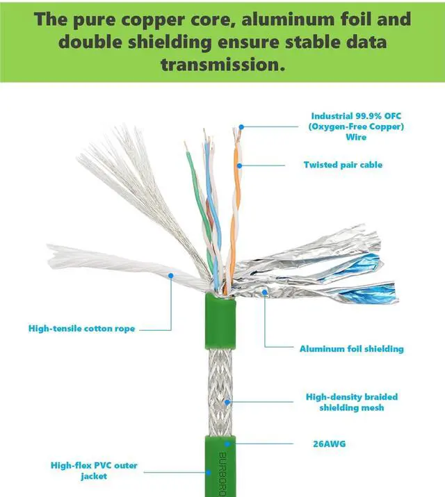 Shielded Cable Construction: Supports stable high-speed transmission up to 1000 Mbit/s with multi-layer shielding including aluminum-foil braid, twisted-pair 24AWG conductors, and cotton filler. The green PVC jacket is abrasion-resistant, oil-resistant, oxidation-resistant, UV-resistant, waterproof, dust-proof (IP67), heat-resistant, flame-retardant, and suitable for drag-chain dynamic applications.