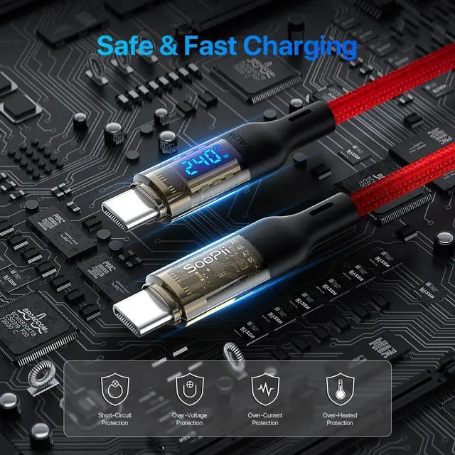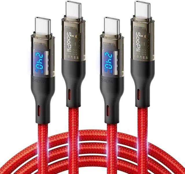SooPii USB C to USB C cable [240W 10ft], Fast Charging USB C Cable with LED display for MacBook Pro, lPhone16/15/15Pro/15ProMax, Galaxy S23+/S23 Ultra/S22 Ultra, etc., Transparent shell(Red-2Pack)