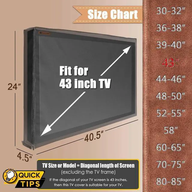 NOTE: If your TV has a soundbar, wide border, or thicker than usual, please measure the length and width of your TV's outer frame and compare it to the size of TV cover ( 40.5"W x 24"H x 4.5"D ) to ensure a proper fit. ^^ PREMIUM 600D