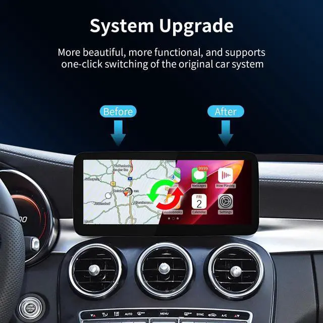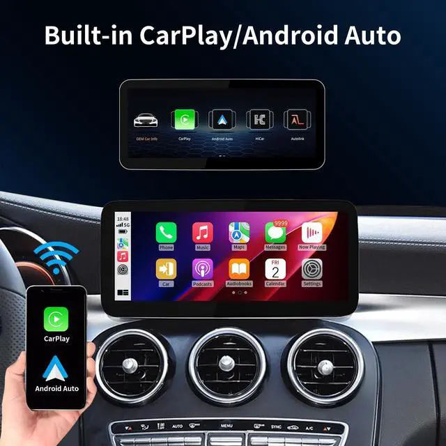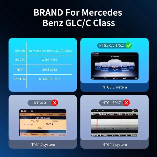 Pre-purchase NoticeThis touchscreen is a 10.25 -inch Linux car display upgrade accessory for Mercedes Benz models. Compatible with Mercedes Benz C/GLC V Class W205 X253 W447 (2015-2018) with NTG 5.0 / 5.1 / 5.2, such as for C180, C/GLC200, C/GLC250, C/GLC300, C/GLC 43AMG, C/GLC 63AMG. If you are not sure about your vehicle system, please consult us. If you are not sure how to install it, you can watch the instructions and installation video we provide. ^^ Built-in CarPlay and Android AutoThis product supports wireless and wired CarPlay and Android Auto, allowing you to seamlessly connect your smartphone to the car system, whether it is iOS or Android system.