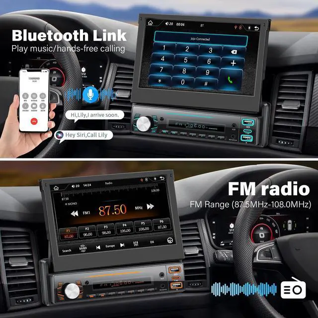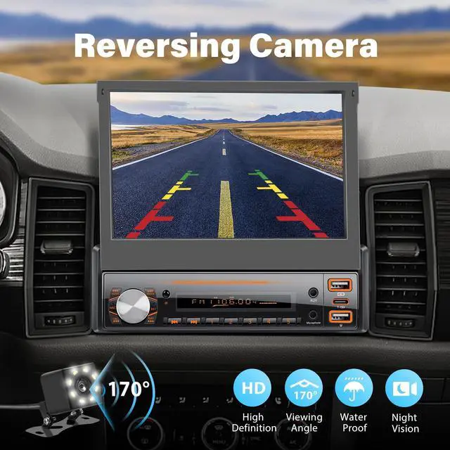 Apple Carplay and Android Auto7 inch manual flip screen car stereo, compatible with Apple Carplay and Android Auto, simply connect your phone to your car speakers via USB cable to access your phone's contacts, emails, notifications, maps and navigation, play music. ^^ Mirror Link and Reversing CameraThis single row seat car stereo is equipped with a reversing camera, after the car radio is connected to the reversing camera, once you put it into reverse gear, the car stereo touch screen will automatically display the reversing camera, which makes your daily parking safer.