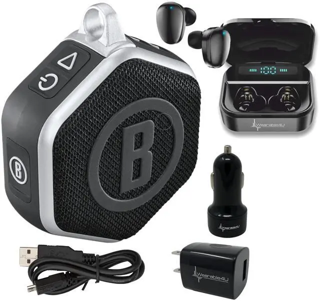IN THE BOX: 1x Wingman Mini Black/Silver GPS Speaker, 1x Carabiner Clip, 1x USB-C Cable, 1x Wearable4U Black EarBuds with Charging E-Bank Case; 1x Wall Charger, 1x Car Charger