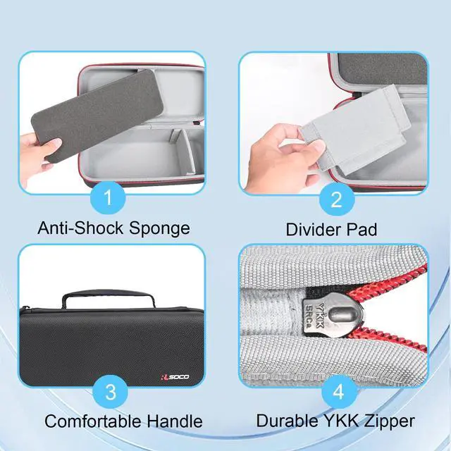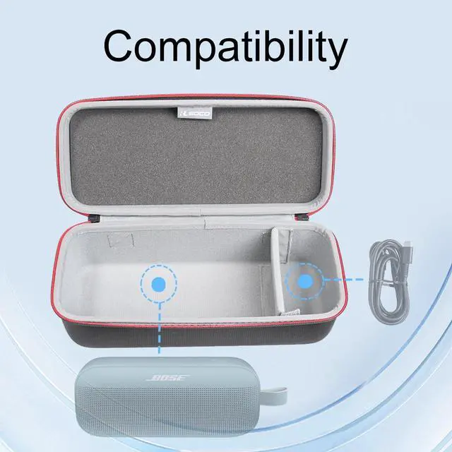 The data cable can be stored in the Velcro compartment. ^^ Portable and Lightweight -- Featuring premium YKK zippers for enhanced smoothness and durability. Its lightweight design makes it easy to carry, with a comfortable external handle allowing you to effortlessly take the speaker anywhere, making it the ideal travel companion. ^^ Eco-Friendly Materials & Self-designed Product -- Crafted from eco-friendly materials, compared to other storage cases on the market, our fabric, lining, and EVA compartments are all certified by RoHS/SGS. We use a higher-grade thickness of EVA to ensure our Self-designed storage cases is not deformed easily.