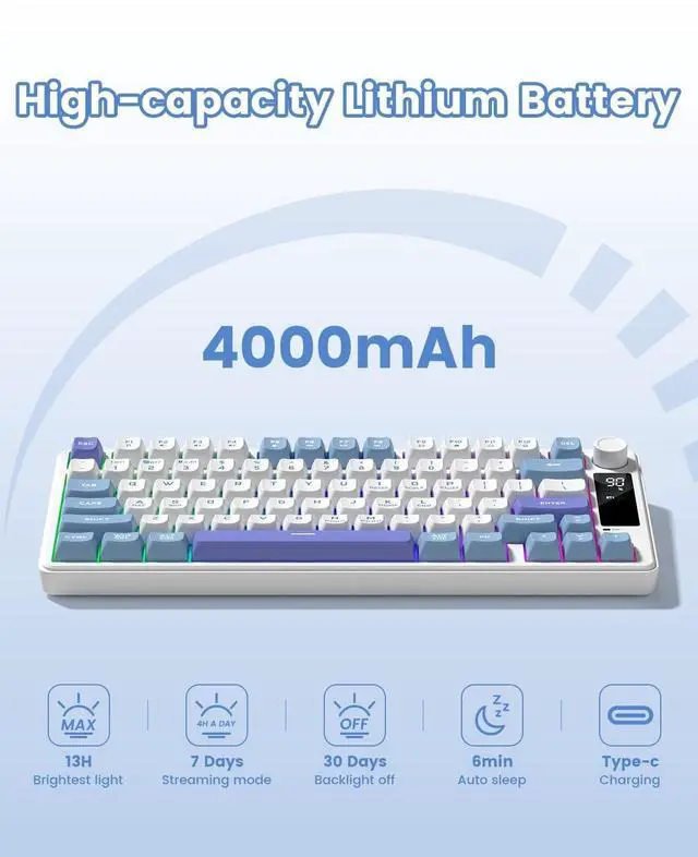 Comfortable Typing Low Noise: Computer keyboards adopt a high-quality membrane switch structure that offers smooth, cushioned keystrokes with minimal soundperfect for shared spaces like offices, libraries, or late-night work. Combined with an ergonomic tilt-angle design, it helps reduce typing fatigue while ensuring a natural and comfortable hand position ^^ Smart Display & Rotary Knob Controls Stay informed with the screen showing battery and connection status. The rotary knob lets you adjust volume or lighting brightness instantly, while 19 anti-ghosting keys, system switch keys, and hotkeys make this a feature-packed choice in pc gaming keyboards, silent keyboard, or cute keyboard setups ^^ Durable PBT Keycaps Oil & Wear Resistant: Crafted from high-quality PBT material, these keycaps are built to last. Unlike ABS keycaps that can shine or fade over time, PBT maintains its texture and appearance, delivering a premium typing feel even after long-term daily use. Resistant to oil and wear, your wireless keyboard will stay clean, crisp, and comfortable. ^^ Long-Lasting 4000mAh Rechargeable Battery Power through days of use on a single charge with a large built-in battery. Auto-sleep helps conserve energy, while fast USB-C charging ensures your wireless gaming keyboard is always ready when you are