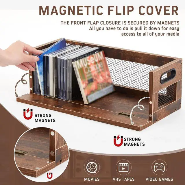 Magnetic Flap: the closure of the front flap is fixed with a magnet, this CD movie storage provides easy access to all your music CDs, movie discs, cassettes, and VHS tapes; The firm magnetic fixtures ensure is secured, safeguarding your valuable CD collections from falling out or being misplaced ^^