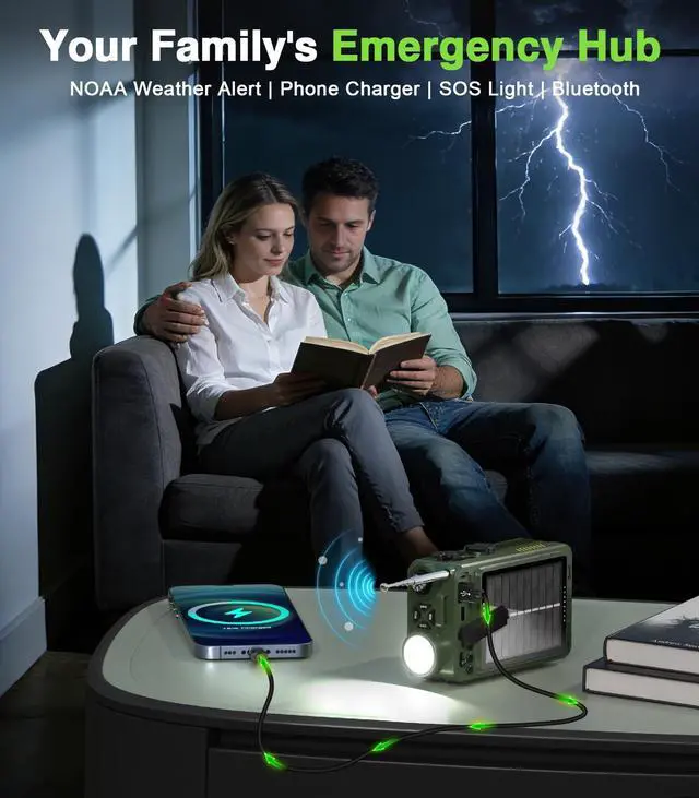 12-in-1 Digital RadioThis outdoor radio features digital radio AM FM, shortwave radio, NOAA weather radio, Bluetooth 5.4, USB drive, TF card, SOS siren, flashlight, 14800mWh Charger Pack, IPX3 waterproof, hand crank/solar/Type-C charging options and more. ^^ WB + SW Radio to Keep You Well PreparedPortable shortwave radios are valued for reliable communication during disasters (e. g., hurricanes, grid failures) when traditional networks fail. Weather Radios receive real-time emergency broadcasts from the National Oceanic and Atmospheric Administration - NOAA emergency weather radio. ^^ Survive Any CrisisThis noaa radio supports SOS alarm, flashlight, 14800mWh/4000mAh phone charger and compass.