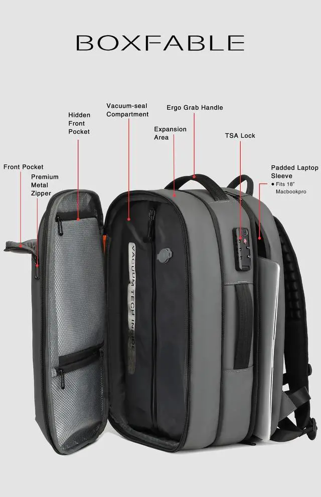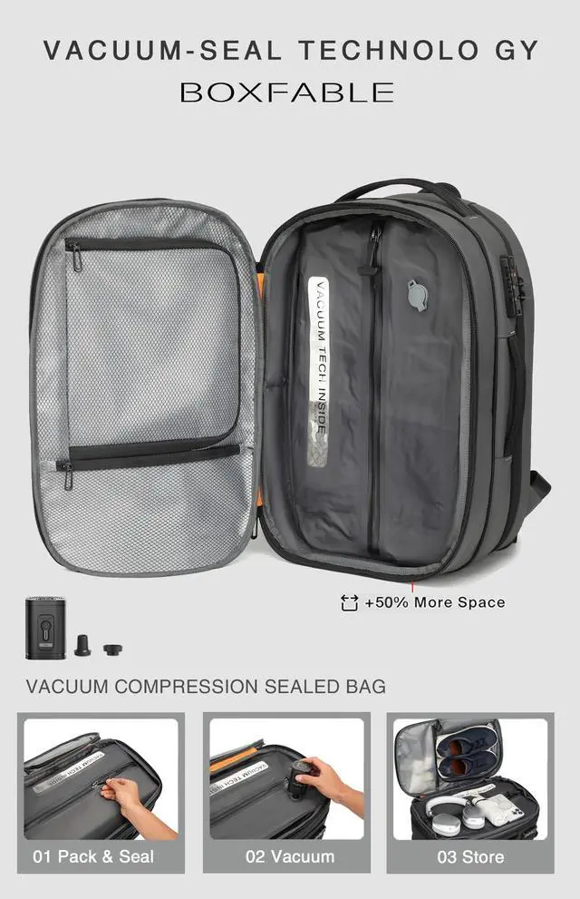 Additionally, a TSA-approved combination lock keeps your belongings safe and secure, providing peace of mind throughout your journey ^^ Multi-functional CompartmentsMen's vacuum travel backpack with three spacious main compartments and multiple hidden pockets. Travel backpacks come with shoe compartments that allow you to separate your shoes from your clothes and block out odors, ensuring your clothes remain clean and fresh on the go. In addition, there is a dedicated laptop compartment that can safely accommodate a 18-inch laptop without damage ^^ Ideal Travel CompanionThe BOXFABLE backpack comes equipped with a TSA-approved combination lock, a luggage attachment strap, thickened and widened shoulder straps, and high-quality zippers.