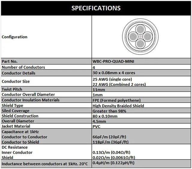 WBC-PRO-QUAD-MINI is truly the Most-Silent & the Most-Flexible Mini-Star-Quad cable in the market & boasts a flexible outer jacket, a dense braided shield (above 98% coverage) & four, 0.08 mm Fine-Stranded 99.99 % Oxygen Free Copper cores (25AWG per core & 22AWG in use). Excellent shielding coupled with the Star Quad design totally cancels out all EMI & RFI, this stage-ready cable will encounter, resulting in the purest form of signal transmission. Superior to Industry leaders like Mogami 2893. ^^ WBC-PRO cables are designed based on science, engineered & manufactured in-house to the highest quality in the industry, and sold at prices that are unbeatable by the pro competition.