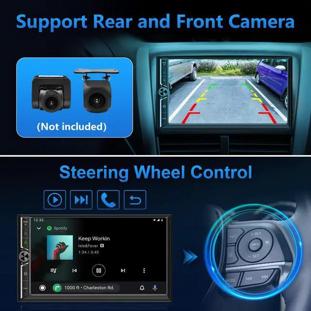 ^^ [More Features]: double din radio apple carplay has the extra features: Various APP Installation, Wifi Internet Connection, Physical Button, Online/ Offline map navigation, Bluetooth 5.4, Steering Wheel Control. USB/SD/Aux input, FM radio, audio/video output, 7 color LED, front and backup cameras input (camera sold seperately).