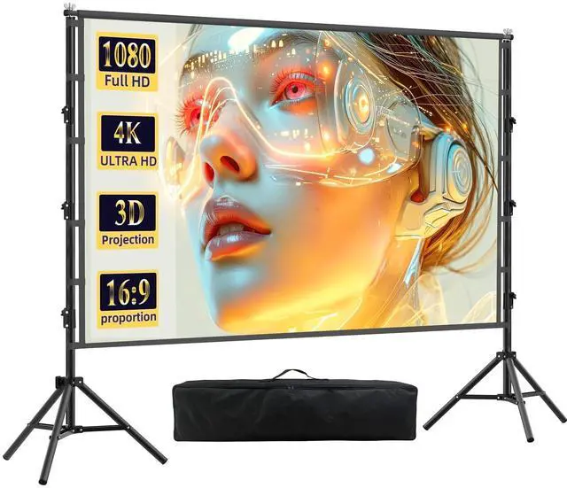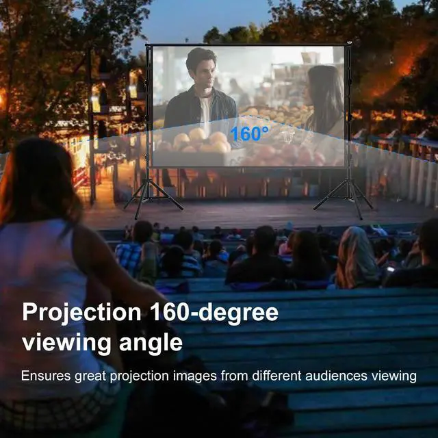 Equipped with windproof ropes, sand bags and ground stakes to strengthen the stability of the brackets, perfect for outdoor use even in slightly windy conditions ^^ Portable Lightweight Projector Screen with Carry Bag120 inch projector screen mount, only 8.9 lbs weight, comes with a portable carry bag for easy carrying and storage. Compact design takes up little space, can be easily stored in the trunk of the car, closet or any storage area, ideal for outdoor camping, backyard parties, or moving between indoor rooms, making high-quality projection accessible anywhere ^^ Wide Application for Indoor OutdoorThis portable projector screen is widely applicable for indoor and outdoor usehome theater, school, office, camping, conferences, weddings, birthday parties, movie screen nights, TV shows, video games.
