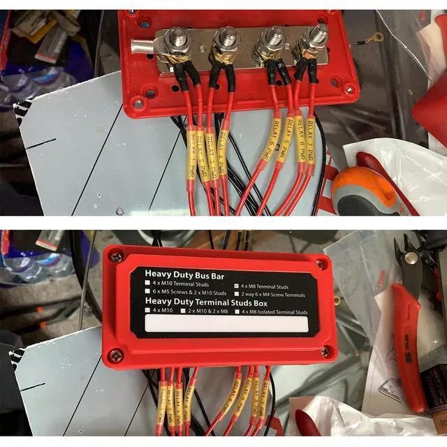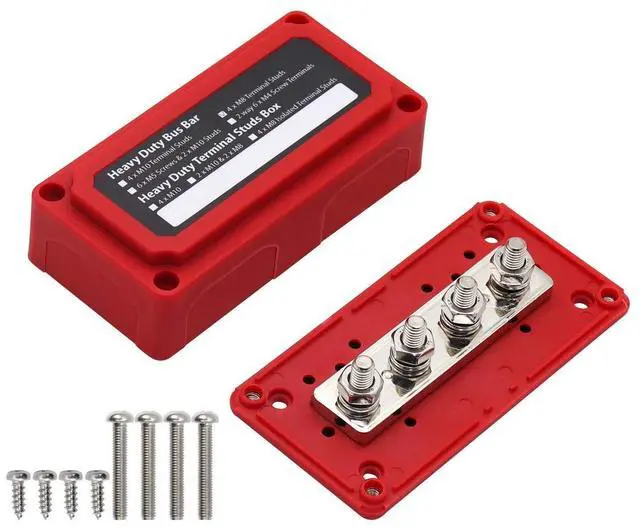 Bus Material: Brass, Nickel plated ^^ 4 studs M8 (5/16"), Removable windows for unobstructed wiring ^^ Dimensions (L x W x