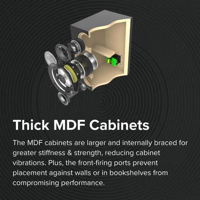 The added strength allows more flexibility in design to achieve a smoother, extended low-frequency response. ^^ THICK MDF CABINETS - The MDF cabinets are larger and internally braced for greater stiffness & strength, reducing cabinet vibrations. Plus, the front-firing ports prevent placement against walls or in bookshelves from compromising performance. ^^ REDESIGNED FROM THE GROUND UP - The original Debut Series changed the game & now its changed again with the Debut 2.0 Series. Redesigned from the ground up, they sound more remarkable than the speakers that sparked a revolution in high-end sound.