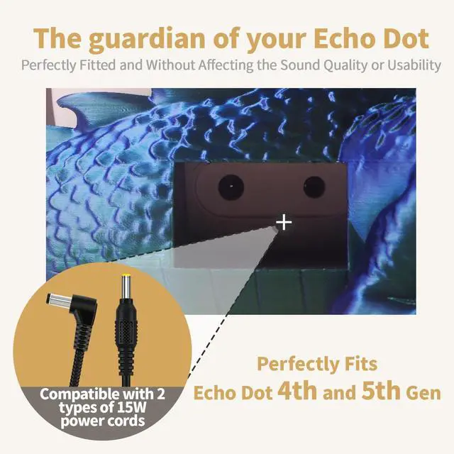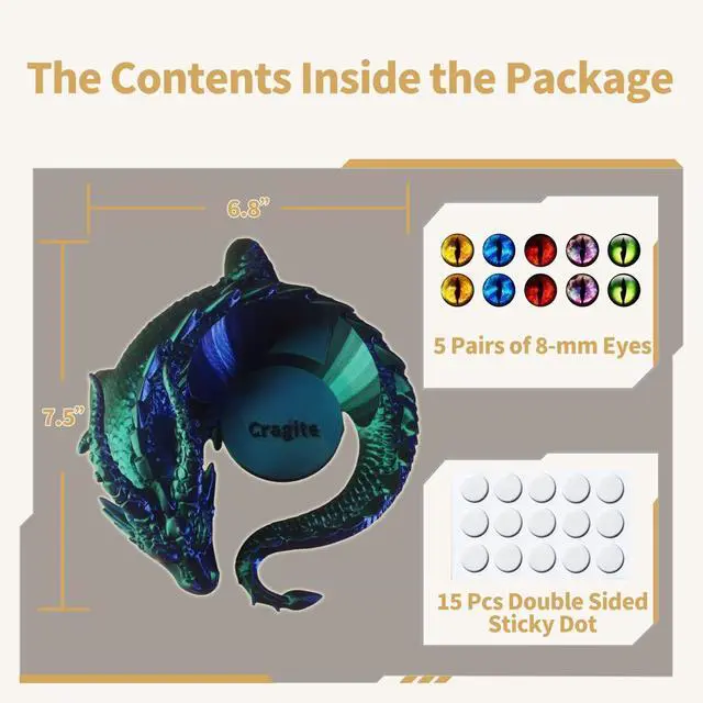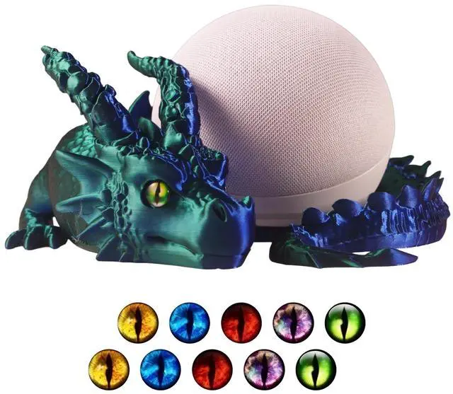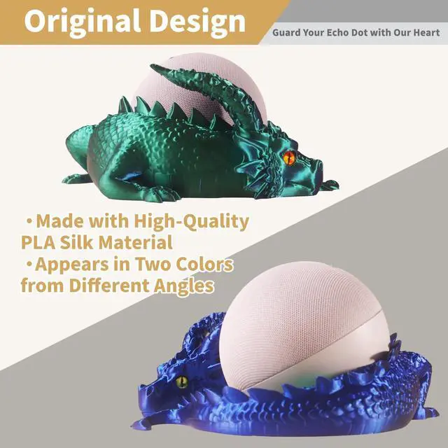 Precision CompatibilityPrecision-engineered from 3D-scanned Echo Dot 4th & 5th Gen data for a locked-in fit, with an oversized rear port that accommodates both straight and 15W L-shaped charging plugs, plus a perfectly aligned cutout for the 3.5 mm audio jack, snaps on securely and stays in place ^^ Dual-Color 3D PrintingCrafted from premium dual-color PLA in a single pass with no paint or assembly, the hue shifts as your viewing angle changes, makes your Echo Dot stand look like a work of art ^^ Customizable EyesIncludes 5 uniquely colored eye pairs and 15 adhesive pads so you can mix left and right for striking heterochromia or keep them matched, swapping in seconds to give your dragon unlimited personalities ^^ A Guardian That Fits AnywherePerches on your desk, nightstand, bookshelf, or kitchen counter without blocking microphones, buttons, or ports, the open-bottom design delivers clear, uninterrupted sound while our original Echo Dot holder guards over your device with fierce presence ^^ Designer OriginalThis original dragon Echo Dot cover is created by Cragite and brought to life through precision 3D printing with no mass-produced tooling, especially suitable for enthusiasts of dragons and mysterious creatures
