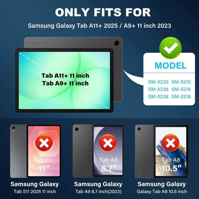 Compatibility: Exclusively Designed for Samsung Galaxy Tab A11+ Plus/A9+ 11-Inch 2025/2023 tablet(SM-X230/X235/X236B/SM-X210/X216/X218). NOT fit for other Samsung tablet model. (With Screen Protector) ^^ For Tab A11+ CaseThis Case for Samsung Galaxy A11 Plus/A9 Plus tablet case Premium Soft silicone rubber and hybrid hard PC + front hard PC bumper 2 in 1 design easier to install and remove than three layer with stands daily drop, bump and shock with four corner cushioning for protection, suitable samsung galaxy tab a9+ case for kids and adults. ^^ 360Rotating Stand & 180FoldsGalaxy A11Plus/A9 Plus case with a 360rotating handle that also folds 180to give you multiple angles between 25-85 degrees of horizontal or vertical orientation, Also offers hand hold and hung on wall using by handle function, allow you use or carry much easier, perfect for a variety of people and occasions. ^^ Protective 9H Tempered Glass Screen ProtectorCase for Samsung Galaxy Tab A11+/A9+ 11 inch with scratch-resistant tempered glass screen protector, it offers exceptional sensitivity and transparency, Tempered glass tablet protectors offer superior durability scratch resistance, and a smoother touch experience, Not only shock/-proof/long-lasting but also comfortable holding feel.
