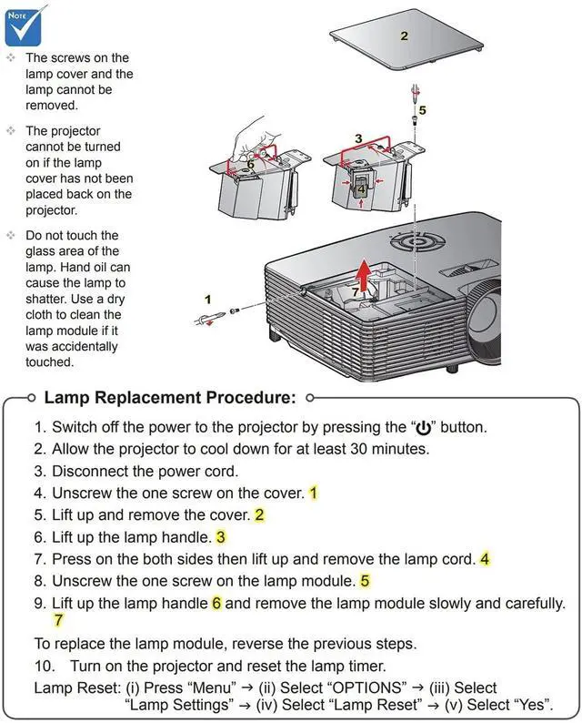 Projector models: For BENQ 5J. J6E 05.001 5J. J9H 05.001 HT1075 HT1085ST I700 MX662 MX720 W1070 W1070+ W1080ST W1080ST+ W1085ST ProjectorsInstalling a Projector LampTo install a projector lamp with the housing, just follow the easy steps below: 1. Make sure the projector is unplugged and sitting on a flat surface2. Loosen the screw holding the projector lamp module cover in place and remove the panel3. Unplug the old projector lamp and remove it from the projector4. Plug the new projector lamp securely into place5. Attach the panel back onto the projector and tighten the screw