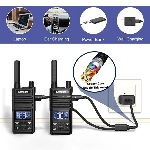 USB-C Charges Long Ranges Radio: SAMCOM T2 dopts the USB-C charging interface setting, come with 2-in-1 charger cable is made of braided process and double thick charging cable, which is more break-proof and safer to charge ^^ Group Call Portable 2