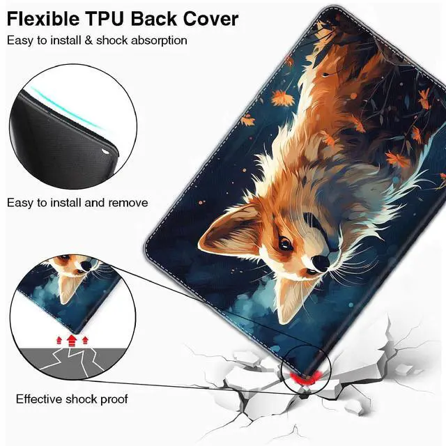 Full ProtectionMade of high quality durable PU leather and soft TPU material that prevents tablet drops from damaging, getting dirty and is easy to clean; Soft inner shell protects tablet screen from scratches; Ensures more effective shock absorption and heat dissipation; Precise cut-outs for easy access to all functions; Corner protection. ^^ Auto Sleep/WakeBuilt-in magnetic stripe, this tablet case supports auto wake/hibernate function, which can enter hibernation state when the case is closed, saving you power and prolonging battery standby time. ^^ Adjustable AngleWith the non-slip stand bar in the way, you can easily adjust it to different angle positions to use the tablet at a more comfortable angle for watching videos at home, reading, or presenting at meetings.