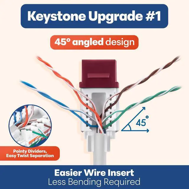 Compatibility - compatible with our 45 Angled speed termination tool - 45Term (B0BL3GS7ZY). The jacks can also work in conjunction with a standard punch down tool and punch down stand for convenience. ^^ 45-Degree Angled Wire Insert - Less bending Required, make it easier to insert the wires ^^ Strain Relief Clamp - Holds The Cable Secure, While freeing up your hands. Clamp Can be Removed on tight in-wall installs ^^ Slim Profile Design - Can be used with a patch panel, wall plate, or surface mount box with standard or slim keystone blank openings.