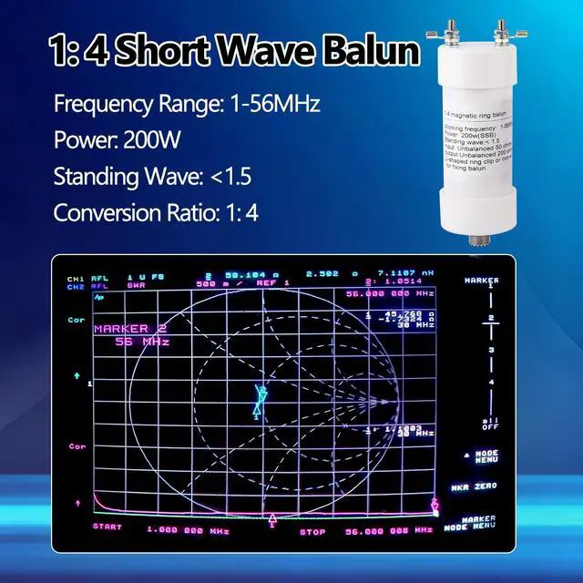 ^^ Balun Output: This Balun can function as an impedance converter for unbalanced to balanced antenna configurations with a 1:4 conversion ratio, transforming the input impedance from 50 (unbalanced) to an output impedance of 200 (balanced) with a VSWR of less than 1.5, reducing signal loss and ensuring efficient operation.