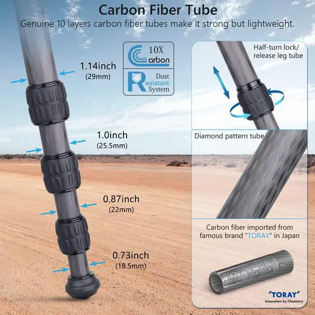 Lightweight Carbon Fiber Tripod: All carbon tubes are made of thick real 10-layer carbon tubes! ( 1.14 in/29mm-1in/ 25.5 mm- 0.87 in/22mm- 0.73 in/ 18.5 mm), Carbon fiber is imported from Japan and hardened by high temperature treatment to be more solid and stable. The main connecting parts are manufactured by CNC machining and polishing and then anodized, not only is the structure more stable, but also looks and feels better. Weight only 4.34 lbs/ 1.97 kg, the latest design of the accessory hole will be a masterstroke ^^ Tall Portable Ball Head