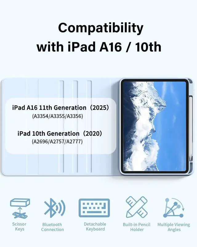 • [iPad a16 Case with Keyboard] Compatible only with iPad (a16) case / 11th generation 11 inch 2025 ( Model: A3354,A3355,A3356), iPad 10th generation 10.9 inch 2022 (Model: A2696, A2757, A2777). Notice: NOT fit any other model. Please check the back of your iPad to confirm the model.(The package does not contain iPad and iPad pencil).