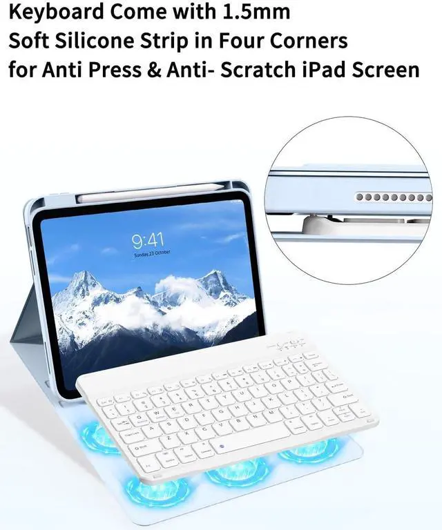 Notice: NOT fit any other model. Please check the back of your iPad to confirm the model. (The package does not contain iPad and iPad pencil). ^^ [Multi Angles & Built-in Apple Pencil Holder] Freely adjustable for the best viewing position, perfect for watching, reading, working or playing games. The iPad 10th generation keyboard case built-in pencil holder, convenient for you to carry your Apple pencil and iPad. Use your Apple pencil whenever you want and never lose it. (Apple pencil or iPad not included! ) ^^ [Soft silicone strip] There four protuberant soft silicone strips in the corner of the keyboard, it can proterct your ipad screen from pressure and scretch when you close the case. ^^ [Detachable Keyboard & Long Stand by time] Magnetic detachable keyboard can be removed from the case. You can remove off the keyboard if you don't need it. And the magnetc strip can auto wake or sleep the screen to extend battery standby time. ^^ [Bluetooth Connection] Turn the bottun to "ON" the power light will shine, and then click "Connect" button the wifi light will shine.