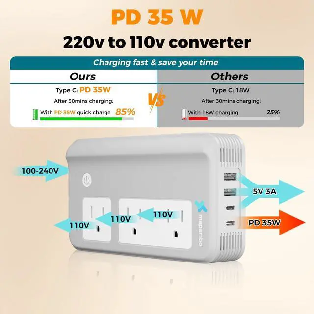 ^^ 7in 1: This 220v to 110v converter can charge up to seven devices simultaneously (3 AC socket +2USB-A+1 Type C+1 Type C PD 35W). This 7-in-1 power adapter enables you to charge up to 7 devices at once without interruptions.