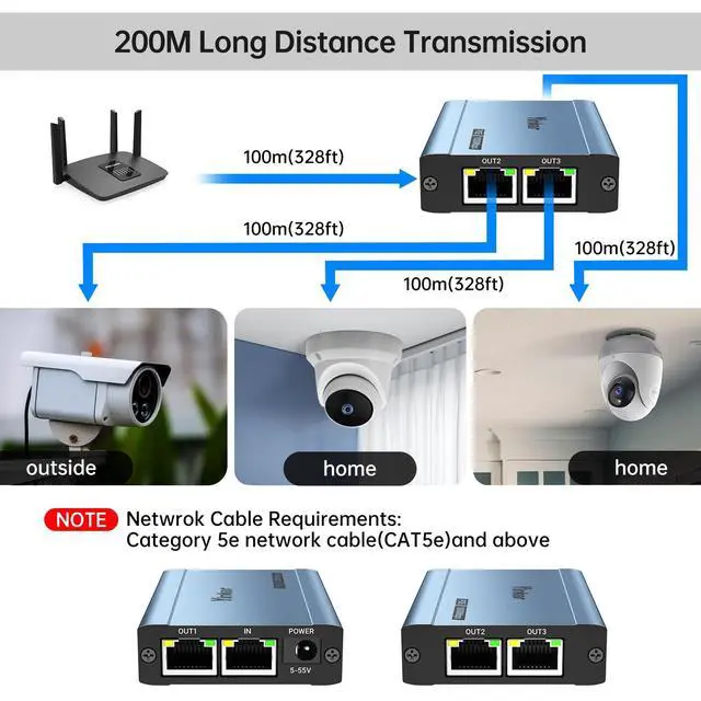 POE Transmission: Multi-Device Stable 1000Mbps transfer ensures smooth 24h multi-camera HD surveillance and low-latency gaming/streaming (PS5+TV). 200m long-distance design (100m switchsplitter, 100m splitterfarthest device) fits large spaces (shops/villas), compatible with Cat5-Cat8 cables ^^