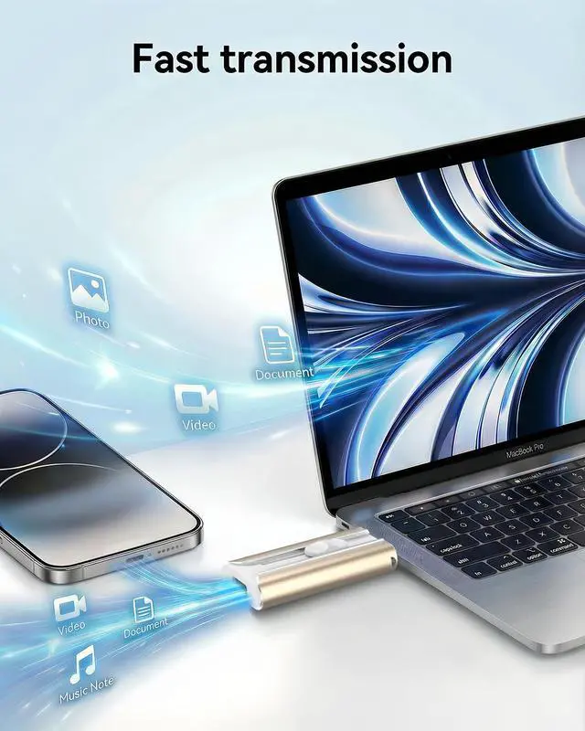 ^^ Multi-port thumb drive: Equipped with Lightning, Type-C, and USB-A ports (including adapter), it easily enables seamless data transfer between various devices such as iPhones, iPads, Android phones, Windows laptops, and MacBooks. No need to prepare multiple data cables for different devices; it allows for quick and convenient data sharing between phones and computers, and between different operating systems, perfectly solving the problem of cross-device data transfer in daily work and life.