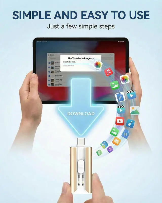^^ High-speed transfer: This usb stick boasts exceptional high-speed data transfer capabilities, enabling smooth and efficient transfer of videos, photos, and files. It simplifies the data sharing process and reduces transmission time. Whether backing up phone data before leaving home, transferring work documents in the office, or sharing travel videos with friends, its fast transfer performance delivers a more efficient and convenient user experience. ^^ One-click backup is quick and easy: This memory stick is fully compatible with iOS 12.1 +, requiring no complicated setup processes or professional technical knowledge. With just a few simple steps, you can easily back up photos, videos, and various work files to a jump drive. It helps you easily break free from the limitations of iCloud storage space, allowing even non-technical users to quickly and conveniently complete data backup. ^^ Portable, rugged, and durable, suitable