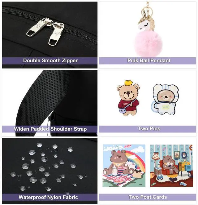 Material &Smooth Zipper: The campus backpack is made of waterproof, ultra-lightweight, high density nylon fabric and cute printing polyester lining. The metal zippers closure are used by the premium quality zippers to ensure the long-lasting usage ^^