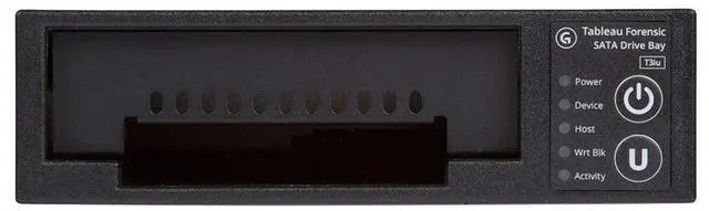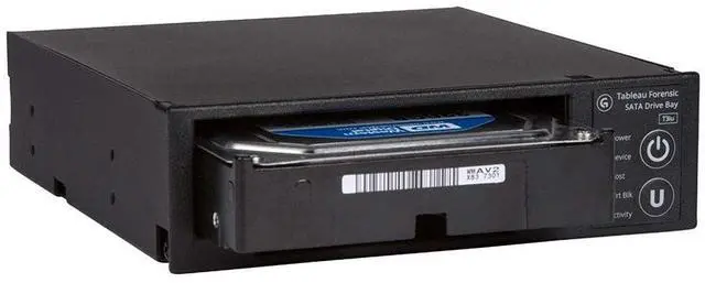 The Tableau Forensic SATA Drive Bay is an integrated write-blocker that mounts in a drive bay of a forensic workstation and supports forensic acquisitions of 3.5 and 2.5 SATA hard drives.