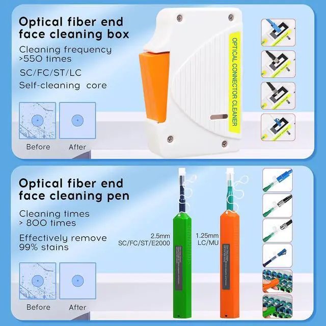 11 in 1: Fiber optic tool bag, cleaning box and replacement core, cleaning pen SC/LC, cleaning cotton swab 1.25/2.5mm, cleaning paper, air blowing, brush, cleaning bottle