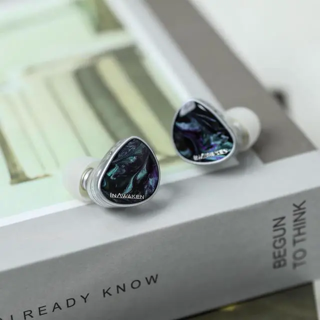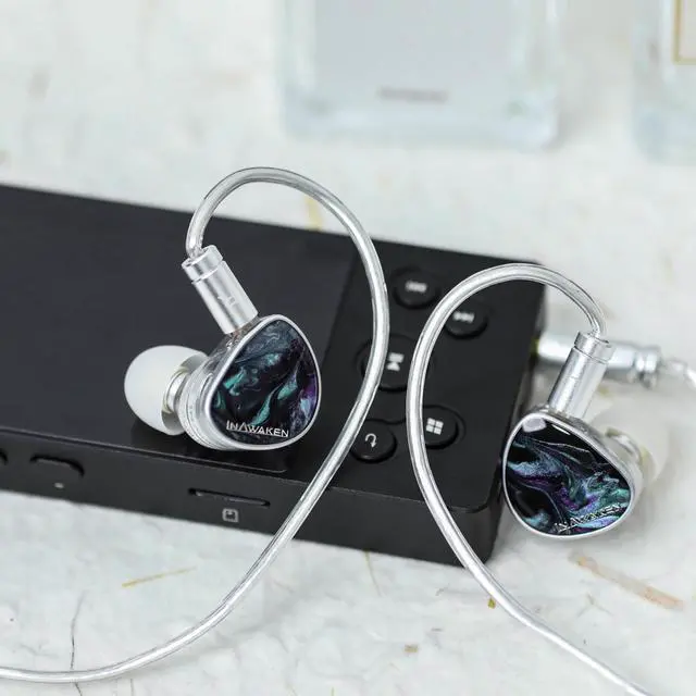 -: The DAWN Ms features an 11.2 mm dynamic driver with a sputter deposition purple-gold diaphragm. This multi-layer diaphragm offers both low-frequency elasticity and high-frequency performance. The interference principle between the base film's reflected light and the coating's reflected light creates a unique and captivating purple-gold appearance, while also enhancing sound quality to new heights ^^: Designed and developed by INAWAKEN, the DAWN Ms's dynamic driver uses a high-precision machined aluminum alloy housing, N52 high-performance magnets, and a 6-layer high-tension coil with dual rear chambers. This design achieves low nonlinear distortion (< 0.05 %) and minimal frequency response variation (< 0.5 dB), ensuring stable and high-fidelity audio performance ^^: Utilizing a proprietary 3D printing technique, INAWAKEN introduces low-frequency air pressure into the back cavity of the dynamic driver, superimposing the bass acoustics twice to deliver more powerful and impactful bass. This system enhances the overall listening experience, providing richer and deeper bass tones. Additionally, INAWAKEN's collaboration with leading 3D printing company Heygears has allowed for the creation of a finely detailed cavity that follows the complex contours of the human ear, enhancing both comfort and acoustic performance ^^: The shell of the DAWN Ms is made from medical-grade, highly transparent resin material, 3D printed for both beauty and comfort. INAWAKEN spent over 13 months refining this high-transparency shell production process to allow users a clear view of the internal structure. Additionally, designers have embedded purely hand-drawn art patterns into CNC precision-machined aluminum panels, combining the aesthetics of art and craftsmanship ^^: The DAWN Ms comes with high-quality oxygen-free copper (OFC) shielded cables, which significantly improve audio quality by reducing signal loss and distortion. The silver plating on the cables enhances electrical conductivity, resulting in smoother and more detailed sound. The shielded design also blocks interference and noise, ensuring pure and focused audio