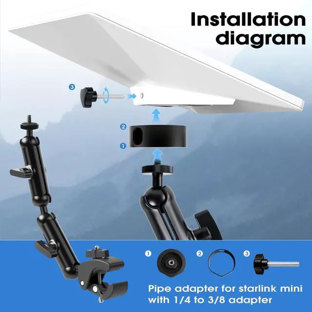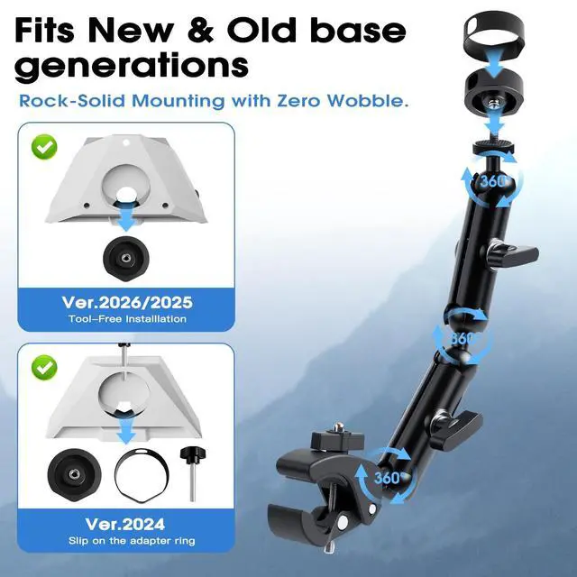 Upgraded Support Arm: The newly upgraded Starlink Mini Mount is twice as long as the arm of the conventional Mount and offers two adjustable knobs and a 360 swivel ball head for easy switching between landscape and portrait modes.