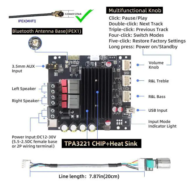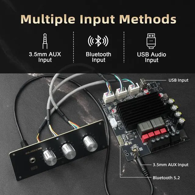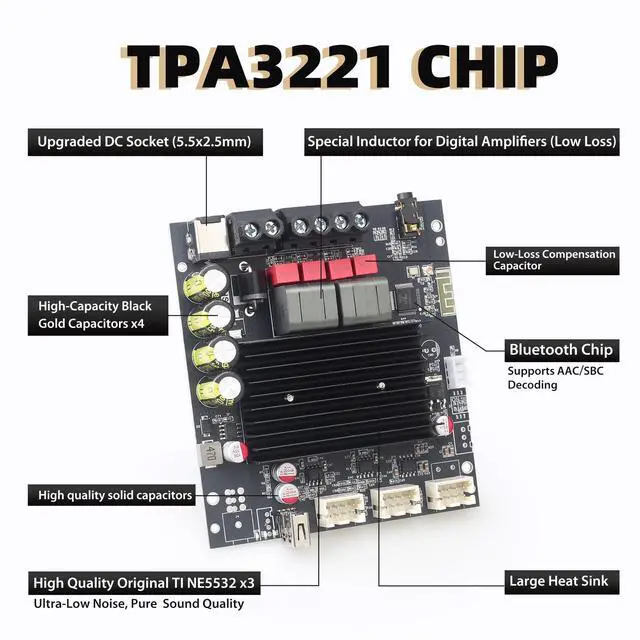 MULTIPLE INPUT OPTIONSThe T100HS-W supports Bluetooth, AUX, USB flash drive, and USB sound card inputs, making it compatible with a wide range of devices such as smartphones, TVs, laptops, and more. Enjoy seamless audio playback in various scenarios. ^^ TPA3221 CHIPThe T100HS is equipped with TPA3221 chips for stereo 2.0 channel output, with a maximum output power of up to 100W+100W and a wide voltage input DC of 12-30V. The large heat sink used allows the amplifier board to operate continuously and efficiently. ^^ WITH DIY PANEL AND AUX EXTENSION CABLEWith this DIY panel, you no longer need to painstakingly measure the punching positions when making Bluetooth speakers.