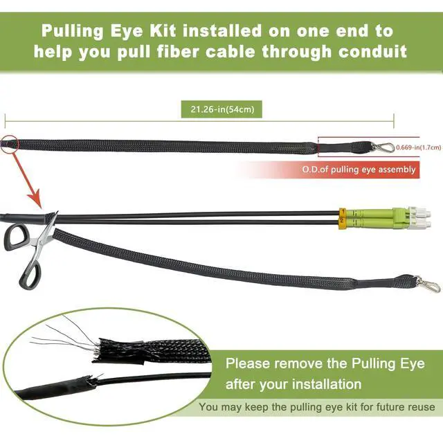 Pre-Terminated OM5 Patch Cables: with swivel pulling eye kit installed on one end to eliminate cable damage during installation. You can remove the pulling eye kit after installation and keep it for reuse. The pulling eye kit is a must for any riser or plenum fiber