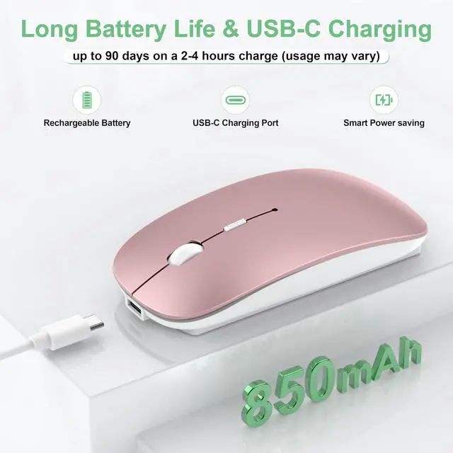 Short press to switch DPI between 800/1200/1600, adapting smoothly to daily browsing, office tasks, and light gaming needs. ^^ Long Battery Life & USB-C ChargingGizdot rechargeable wireless mouse features a built-in 850mAh battery that lasts up to 90 days on a 2-4 hours charge (usage may vary). USB-C charging works with MacBook/iPad chargers and most modern USB-C adaptersno extra cables or AAA batteries needed, eco-friendly & cost-saving.