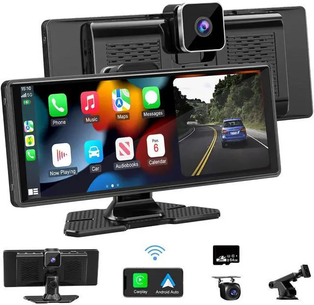 (Note: Compatible with iOS 8.0 or later / Android 11 or higher. Important ) ^^ 4K/1080p Dual Cam RecordingThe portable carplay screen is equipped with 4K front camera and 1080P rear camera, which can be switched to dual-screen loop recording on the screen, with a clear and wide field of view and a viewing angle of up to 170, With a lock function, important videos will not be lost. You can watch the video playback on your phone repeatedly to avoid missing any important moments. ^^ Dual Bluetooth & Voice ControlThe protable carplay supports dual Bluetooth output systems. You can connect your phone via Bluetooth and pair your phone with the car's Bluetooth to play audio directly through the car's speakers. It is also equipped with an intelligent voice control system, you can send voice commands to access Siri, such