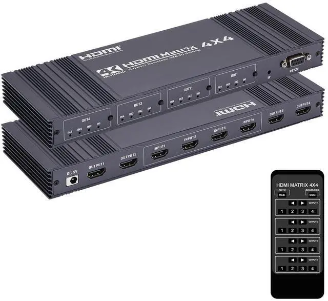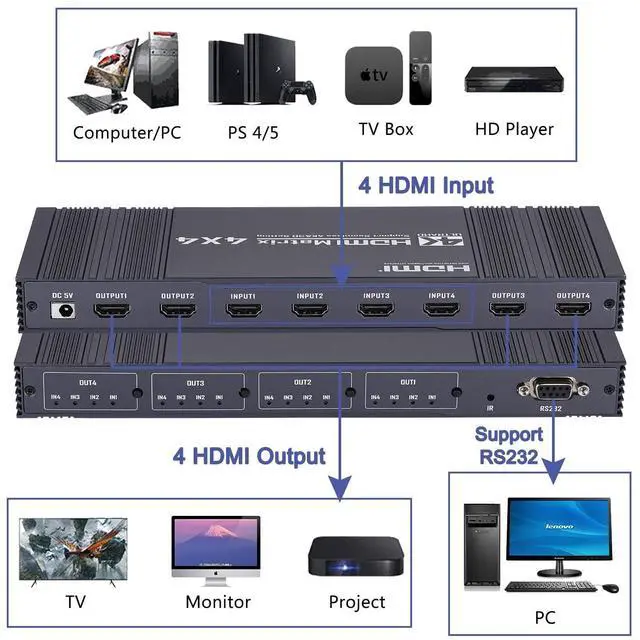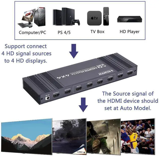 The HDMl matrix 4x4 can connect 4 HD signal sources to 4 HD display terminals. The matrix allows four HDMl devices to be switched or split easily to four HDMl compatible monitors or projectors. ^^ Support highest resolution up to 3840x2160@30Hz. It supports HDMI 1.4, HDCP 1.4, 3D. Support 10.2 Gbps data rate and tmds clock up to 400Mhz. Support deep color 8/10 bit. ^^ Supports 3