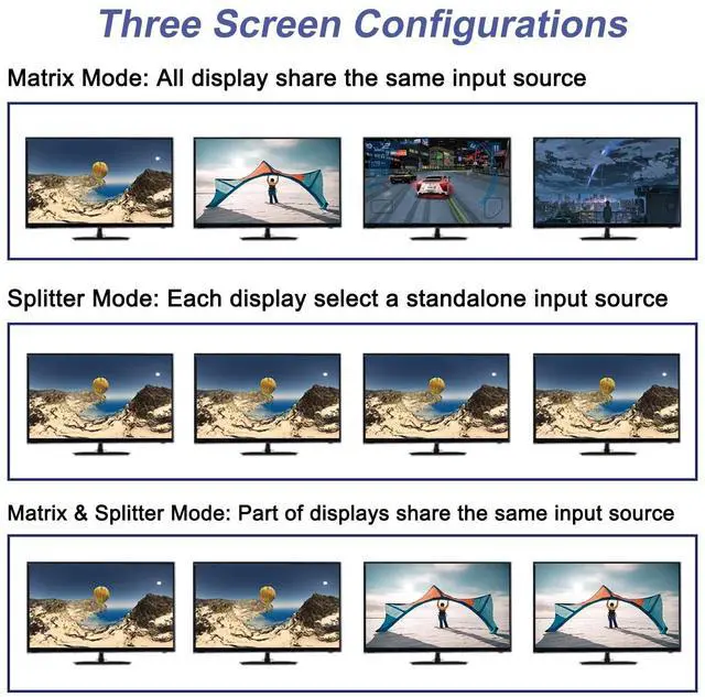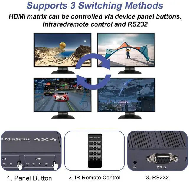Switching Methods: HDMl matrix can be controlled via device panel buttons, IR remote control and RS232. When Switch by a panel button or remote control, Please Wait 3-5S to show on display.