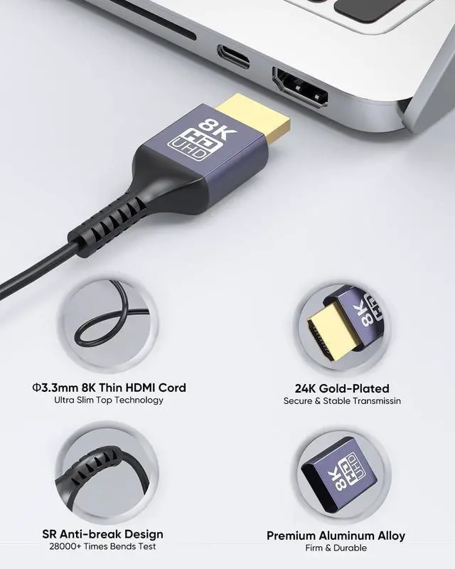 Ultra Thin Flexible Design: The latest 8K HDMI cable diameter is only 3.3 mm that is less than 70% of regular cables. Designed to be lighter and flexible&slim, easy to use and carry (weight: 1.76 oz). Ideal for travel, office and home use to save space ^^ 8K@60Hz