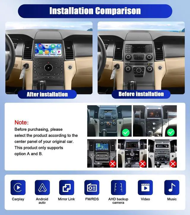 Applicable Car ModelsThis android car radio is For Ford Taurus 2011-2016. NotePrior to purchasing, please confirm the year, size, and form of your car's center console. If uncertain, feel free to send us a message or picture for further assistance ^^ Wireless/Wired CarPlay and Android AutoFor 2014 ford taurus radio with wireless CarPlay and Android Auto features, there's no need for a USB cable. You can directly use Maps, Music, and calls in your car. Apps like GPS Maps, Spotify, and iTunes integrate seamlessly for online access ^^ GPS Navigation&WiFiCar radio for ford taurus 2015 with GPS positioning system, pre-installed with Maps.