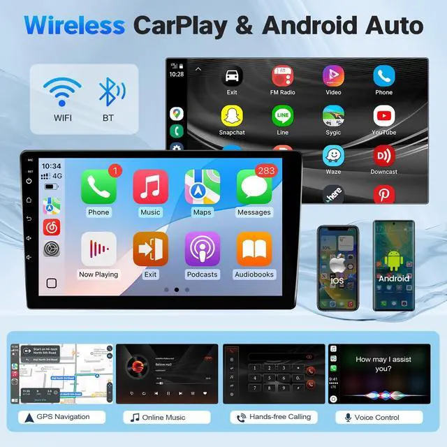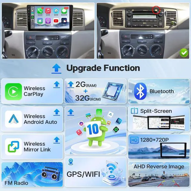 Through a USB cable or Bluetooth connection, all the applications on the mobile phone can be synchronized with the car radio, which is equivalent to a smartphone. With IPS touchscreen (1280x720 resolution), split-screen mode makes the head unit for 2003 toyota corolla run navigation and music apps simultaneously. ^^ Wireless CarPlay & Android Auto with Voice ControlFor 2006 Toyota Corolla Android Carplay Radio, supports wireless CarPlay & Android Auto, connect this touchscreen radio for 2005 Toyota Corolla to your mobile phone for calls, music, maps, and through your voice to wake up Siri or Google Assistant to operate Apps on your phone, easily to take what you want to do on your phone while driving.
