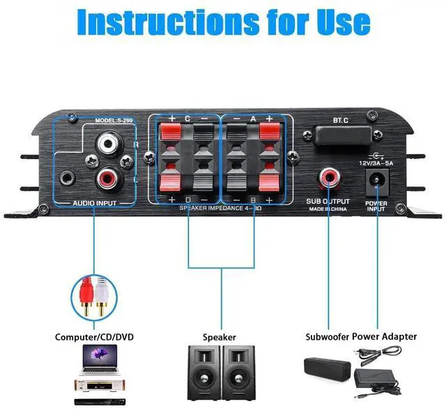 RMS 4x40W + 4.1CH Active Subwoofer SUB interface Only-- Offers you a maximum power of 800W, allowing you to control 2 pairs of high-capacity speakers and an active subwoofer (Only compatible with active subwoofers with SUB jacks). You also get an A/B switching mode, allowing you to control all the speakers together. ^^ High Fidelity SoundIt has a high-capacity transformer that gives you clear sound without distortion. It has a harmonic distortion less than or equal to 0.04 %, which helps you listen to clear and crystal-clear music.