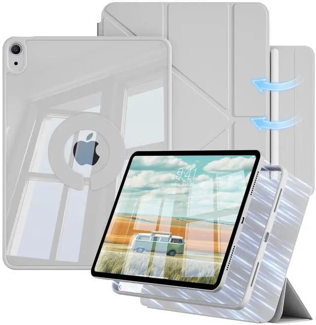 Model number: A3460, A3463, A3364, A3266, A3267, A3270, A2902, A2903, A2904, A2588, A2589, A2591, A2316, A2324, A2325, A2072, Not compatible with any other devices. Please check the back bottom of your iPad to find the model number. ^^ Detachable Standalone Design & Magnetic Pencil HolderThis New iPad Air M3 case features a fully detachable magnetic design. The back shell can be easily detached and used independently as a slim, standalone protective case, or mounted on any magnetic surface for hands-free viewing. The integrated magnetic holder securely stores your Apple Pencil (not included). This external holder design ensures a more portable profile compared to embedded styles. ^^ 360 Magnetic Rotation & Adjustable Stand Go beyond the standard trifold, the strong magnetic connection allows for 360 rotation of your iPad air 5th generation, enabling effortless switching between portrait and landscape modes. Combined with the adjustable trifold front cover, it provides versatile viewing angles for typing, watching videos, presentations, or drawing, adapting perfectly to any scenario type comfortably at a 30 angle or watch videos at an optimal 65 angle.