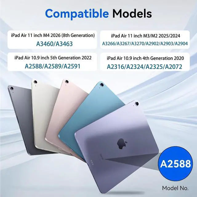 • CompatibilitySmart Clear Case designed for iPad Air 11-inch M4/M3/M2 2026/2025/2024, iPad Air 5th/4th Generation 10.9 inch 2022/2020 released tablet. Model number: A3460, A3463, A3364, A3266, A3267, A3270, A2902, A2903, A2904, A2588, A2589, A2591, A2316, A2324, A2325, A2072, Not compatible with any other devices. Please check the back bottom of your iPad to find the model number.