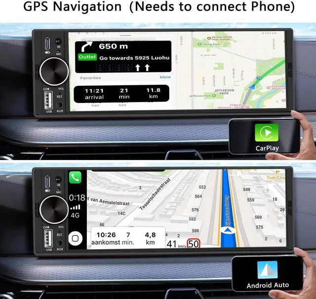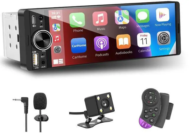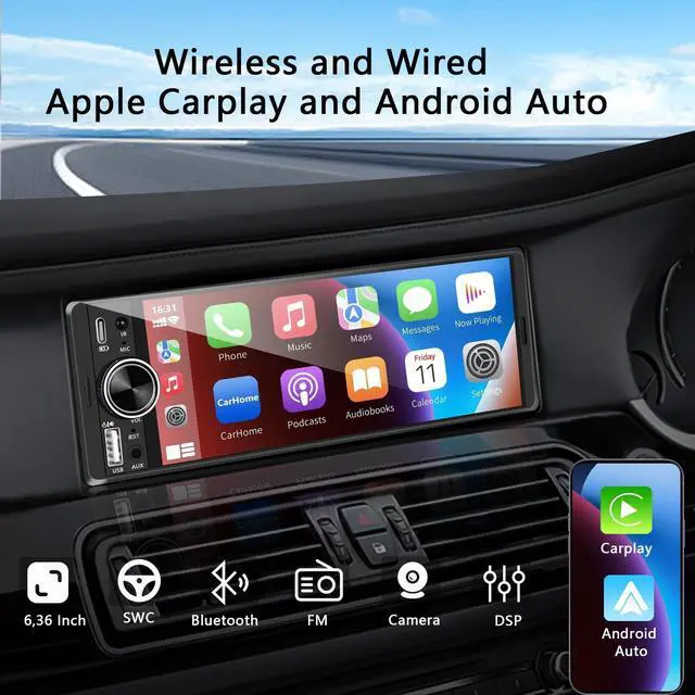 Wireless & Wired CarPlay & Android AutoThis Bluetooth car stereo supports iOS/Android cell phone users with wireless CarPlay and Android Auto features, which accesses your phone's contacts, email, radio, notifications, maps and navigation. So you can make calls, access music, do GPS navigation, send and receive messages and more! ^^ 6.28 Inch Touch Screen & Mirroring Link This single din radio with screen supports mirroring function for iOS and Android phones, he is equipped with a 6.28 inch touch screen, just connect your phone's USB cable to the radio jack or use the wireless carplay, you can project your phone's image to the radio screen and enjoy more functions, such as movies, maps and more.